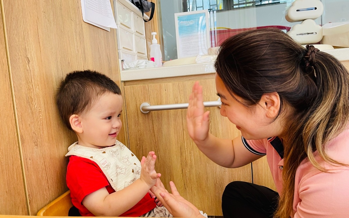 他会主动走到老师面前,伸出小手求抱抱,用他独特的“婴语”和老师聊天。