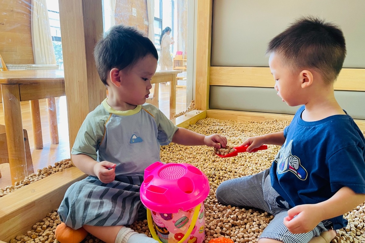 社交互动,他开始和新的小伙伴有眼神和动作的交流,还会分享玩具,建立信任!