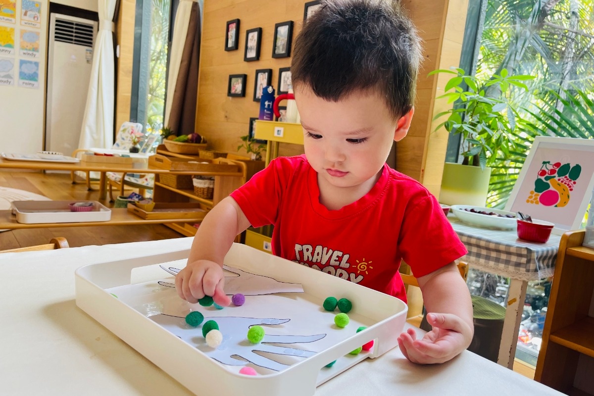 记得他第一次来,紧紧拉着Nido班朱朱老师的手,但大眼睛却不停地打量这个新世界。慢慢地,在国际班老师的邀请和Nido班朱朱老师的鼓励下,家润伸出小手,尝试了新的工作材料,加入集体课堂!